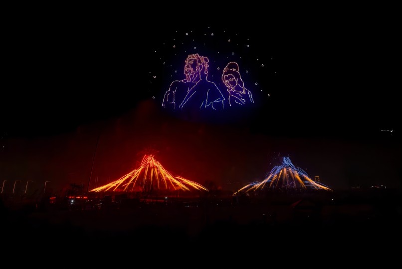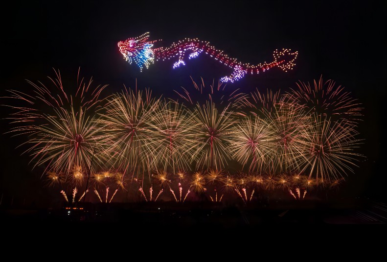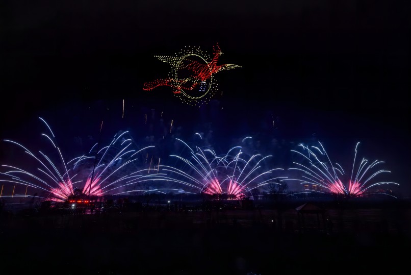 在煙花秀表演期間,由1000架無(wú)人機組成無(wú)人機群在空中組成了多個(gè)畫(huà)面,“鳩茲和鳴”鳩鳥(niǎo)飛舞栩栩如生,還有“龍呈祥瑞”金龍昂首喚春歸。