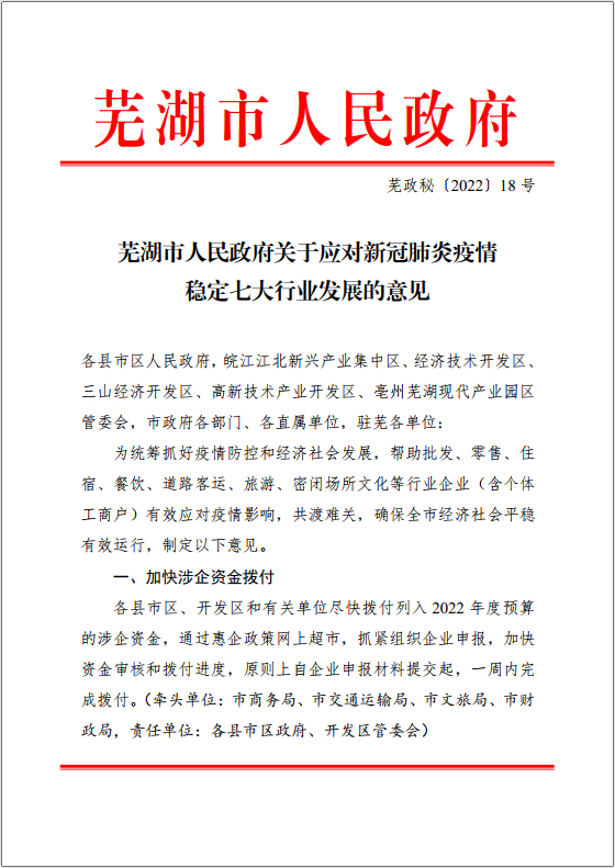 蕪湖市人民政府關(guān)于應對新冠肺炎疫情穩定七大行業(yè)發(fā)展的意見(jiàn)