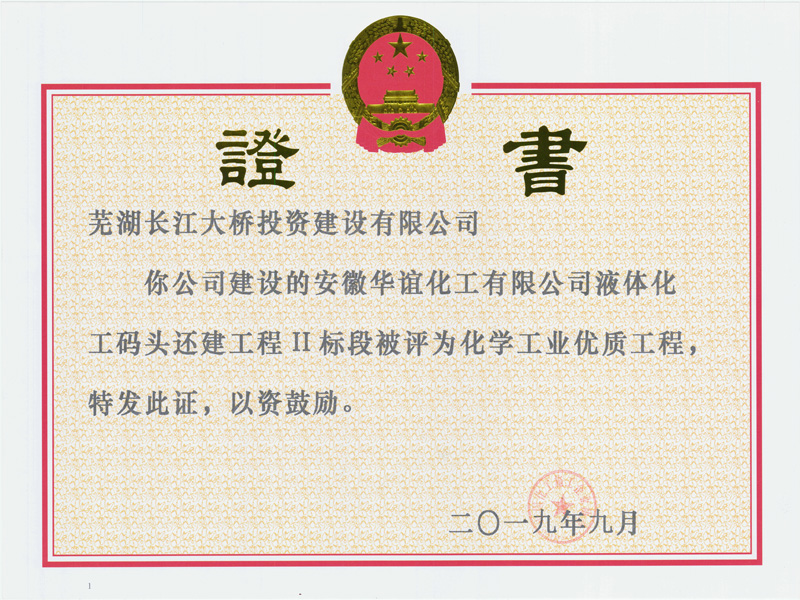 日前,由我公司建設的安徽華誼化工有限公司液體化工碼頭還建工程Ⅱ標段項目,被中國化工企業(yè)施工協(xié)會(huì )評為化學(xué)工業(yè)優(yōu)質(zhì)工程。