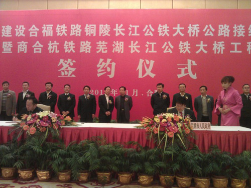 在簽約儀式上,省投資集團公司分別與蕪湖市政府、銅陵市政府簽訂了“合作建設合福鐵路銅陵長(cháng)江公鐵大橋公路接線(xiàn)工程和商合杭鐵路蕪湖長(cháng)江公鐵大橋工程”框架協(xié)議;省投資集團公司分別與蕪湖市交投公司和銅陵市交投公司簽署“合作建設合福鐵路銅陵長(cháng)江公鐵大橋公路接線(xiàn)工程合同書(shū)”。兩項投資協(xié)議的簽署標志著(zhù)商合杭鐵路蕪湖長(cháng)江公鐵大橋、合福鐵路銅陵長(cháng)江公鐵大橋公路接線(xiàn)工程兩個(gè)項目公司正式成立運作,對我市實(shí)施擁江發(fā)展具有重大的戰略意義。