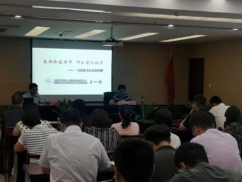 作為安徽首批援鄂醫療隊總負責人,姜小敢主任曾帶領(lǐng)團隊分別在武漢太康醫院、協(xié)和東西湖醫院、肺科醫院開(kāi)展了“疫情阻擊戰”、“疫情圍剿戰”和“疫情殲滅戰”。姜主任從抗疫經(jīng)歷回顧、感悟抗疫精神、體會(huì )制度優(yōu)勢等三方面回顧和分享了他馳援武漢抗擊疫情的經(jīng)歷和體會(huì )。一幅幅身臨一線(xiàn)的圖片、一段段飽含深情的話(huà)語(yǔ),生動(dòng)再現了疫情發(fā)生后,全國各地醫護人員、防疫人員、共產(chǎn)黨員及社會(huì )各界不怕危險、不怕?tīng)奚?,筑起防御病毒的堅強堡壘的感人事跡。那一段段用生命守望生命的故事讓現場(chǎng)的每位聆聽(tīng)者心靈都受到強烈震撼和感動(dòng)。